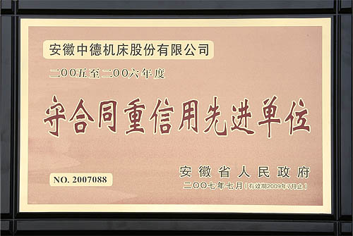 克日,安徽中德机床股分无限公司被安徽省国民当局授与2005-2006年度“守条约重诺言进步前辈单元”这一称呼。这也是我公司继由马鞍山市工商局、市国民当局、省工商局屡次授与此类称呼后,再次获得的更高级别的声誉。