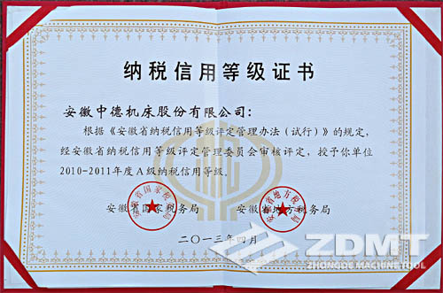 中德机床喜获安徽省“A级征税诺言品级单元”称呼